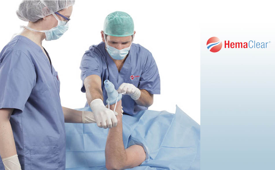 The HemaClear orthopedic tourniquet for the lower extremity is used for total knee replacement, arthroscopy, lower extremity trauma, and in any situation where the surgeon requires a bloodless field of the lower extremity. The tourniquet’s unique shape and elasticity prevents it from slipping during procedures and enables a larger surgical field, especially important with short or wide limbs. As with all HemaClear sterile surgical tourniquets, the tourniquet for the lower extremity fits all patients and is applied in seconds without the need for additional equipment.